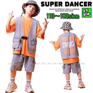キッズダンス衣装セットアップ ヒップホップ ファッション ベスト 長袖シャツ デニム K-POP オレンジ