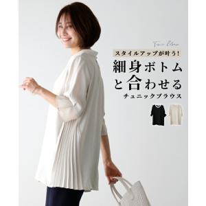 トップス ブラウス チュニック チュニックブラウス スタイルアップ 体型カバー サイドプリーツ シフォン襟 異素材