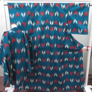 ウール着物 単衣 女性用ウールアンサンブル2点セット 羽織&着物 ブルー系 絣調 矢羽根柄 しつけ糸付き バチ衿 カジュアル 普段使い