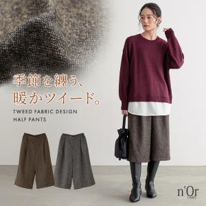 ハーフパンツ レディース ボトムス 膝丈 ツイード ウールライク タック ワイド ウエストゴム 裏地付き ポケット 秋 冬「メール便不可」「20」
