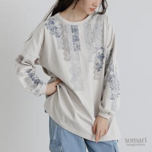 ロンT レディース 長袖 レースプリント カットソー 綿100% コットン100% ニュアンス ヴィンテージ感 かすれプリント スリット ギャザー「メール便可」「10」