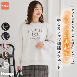 トップス スウェット 長袖 ハニぽか あったか ゆったり 綿混 クルーネック ロゴ レディース SALE Honeys ハニーズ 裏起毛ゆるカレッジ刺繍