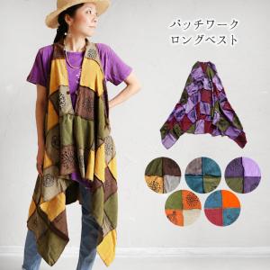 ロングベスト ロングジレ ベスト ジレ ロング丈 エスニック 山ガール レディース カジュアル ファッション パッチワーク ゆったり 前開き 羽織り トップス