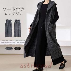 ベスト ロング ウール レディース ニット ノースリーブ ロングジレ ロングベスト フード付き カーディガン トップス アウター 秋冬 前開き フード付き ゆったり