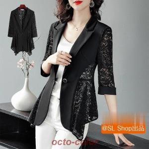 ジャケット レディース スーツジャケット トップス アウター レース 切り替え Vネック ママスーツ 短丈 40代 50代 60代 スーツ 七分袖 2022夏 新作