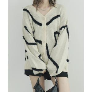カーディガン オーバーサイズニュアンスパターンカーディガン / ニット 長袖 Vネック メンズライク 大人カジュアル シンプル 韓国 ベージュ ブラッ