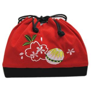 【訳有り 少難あり】 巾着 バッグ 刺繍入り 底かご ちりめん 赤黒地金糸入り鞠桜 卒業式 袴 着物 和柄 長方形 女性用 レディース はかま 赤色