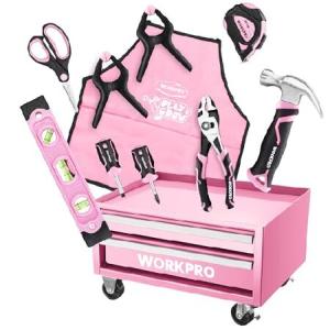 並行輸入 WORKPRO ピンク 初心者ツールセット スターターツールボックス 10個 小型リアルハンドツールセット 引き出し2個付き 金属製ローリングツールチェスト