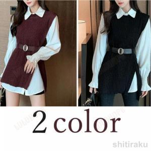 レディース 韓国ファッション 2点セット ニット + カットソー セーター Vネック タートルネック 可愛い フェミニン きれいめ 上品 体型カバー おしゃれ お出