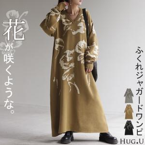 ワンピース ジャガード 花柄 綿100% レディース ロング Vネック ドロップショルダー ニット リブ チクチクしない Aライン 総柄 ロングワンピース マキシ