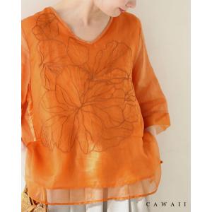 Sから3L対応 ベール重なる花刺繍のシアーブラウストップス