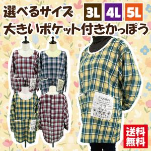 【送料無料】選べるサイズ大きいポケット付きカッポウ 3L,4L,5L 大きいポケット付き カジュアル 割烹着 可愛い 袖ゴム 保育士 格子柄