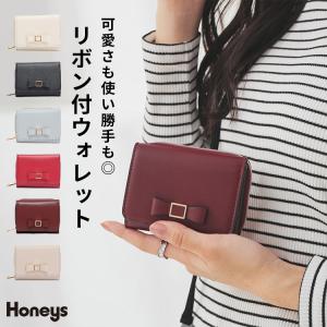 財布 ミニ財布 三つ折り ウォレット リボンモチーフ付き 合皮 フェイクレザー レディース Honeys ハニーズ リボン付ウォレット