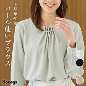トップス ブラウス 長袖 大きいサイズ オフィス きれいめ 無地 再生ポリエステル クルーネ Honeys ハニーズ パール使いブラウス