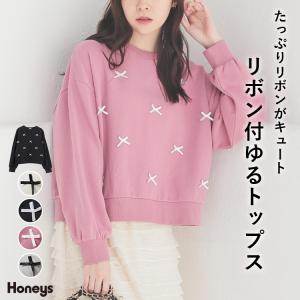 トップス スウェット 長袖 ゆるトップス ゆったり クルーネック リボン 裏毛 綿100 SALE Honeys ハニーズ リボン付ゆるトップス