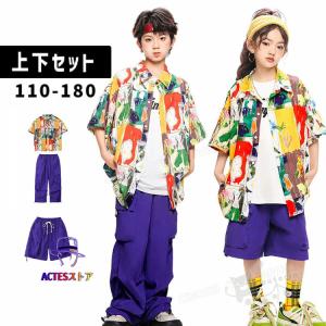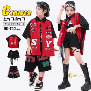 k-pop 衣装 赤 柄シャツ 半袖 キッズダンス衣装 セットアップ レッド ジャケット ヒップホップ 黒パンツ ハーフパンツ 男の子 ガールズ 韓国 ゆったり キッズ ア