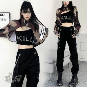レディース k-popダンス衣装 セットアップ 大人 ヒップホップ 韓国 迷彩トップス 黒ブラック ベスト トップス パンツ ステージ衣装 チアガール 衣装 上下 へそ