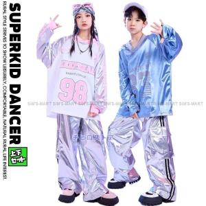 キッズダンス衣装 セットアップ 派手 メタリック キラキラTシャツ 銀 シルバー K-POP 韓国 ヒップホップ 衣装 ナンバリング ピンク 水色