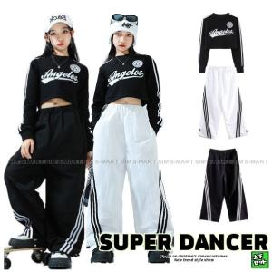 キッズダンス衣装 セットアップ へそ出し トップス ラインパンツ ヒップホップ 衣装 K-POP 韓国 レッスン着 子供ダンス服 ガールズ 黒 白