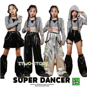 ダンス衣装 キッズ セットアップ K-POP 韓国 ガールズ ヒップホップ 衣装 シルバー 黒 ヘソ出しトップス スカート パンツ 派手