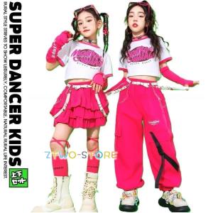 キッズダンス衣装 セットアップ ガールズ ヒップホップ 衣装 K-POP 韓国 子供ダンス服 ダンスウェア 派手 へそ出し トップス スカート 白 ピンク