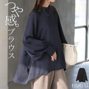 ブラウス レディース ノーカラー トップス バンドカラー シャツ ロング ロングシャツ サテン生地 長袖 無地 きれいめ ゆったり ラグランスリーブ ボリューム袖