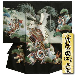 お宮参り 着物 男の子 絹100% 正絹男児初着 黒 グレー 鷹 金彩絵巻文様 地紋生地