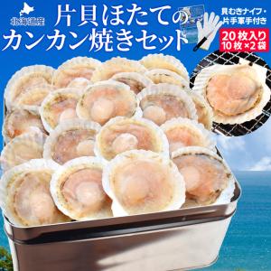 ほたて カンカン焼きセット 20枚入 冷凍ほたて 送料無料 北海道産 半缶入り(貝むきナイフ・片手用軍手付き) ほたて片貝 海鮮 バーベキューセット