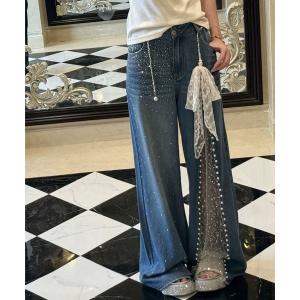 ジーンズ デニム デニムパンツ レース×パール切替ビジュー付きワイドパンツ レディース