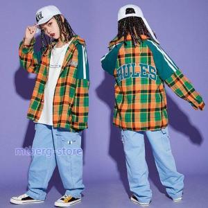 ヒップホップ キッズダンス衣装 韓国子供服 かっこいい ステージ衣装 シャツ 練習着 男の子 女の子 Tシャツ 上下セット チェック柄 デニムパンツ