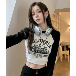 tシャツ ショート丈 ロンT ラグラン ロングTシャツ 長袖 クロップド丈 ロゴプリント レディース