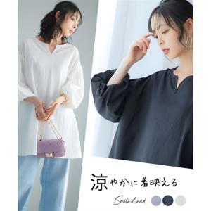 チュニック 大きいサイズ レディース 涼やか綿混サッ カード ビー織バルーンスリーブ ブラウス 7分袖 体型カバー お尻隠れる L〜LL/3L〜4L ニッセン nissen