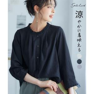 シャツ ブラウス 大きいサイズ レディース 涼やか綿混サッ カード ビー織フリルタック 7分袖 L/LL/3L/4L/5L ニッセン nissen