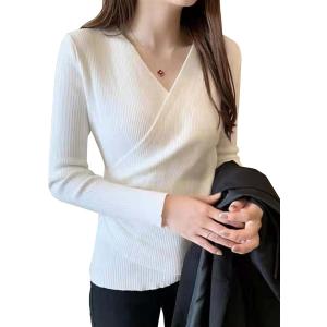 マリアマーファ 5色カラー 長袖 Vネック リブニット カシュクール 無地 サマーニット ボタン セーター オフィス(ホワイト, L)