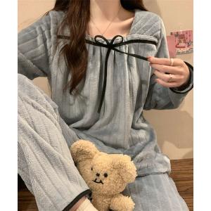 パジャマ ルームウェア フロントリボン リブフリース ルームウェア セットアップ レディース