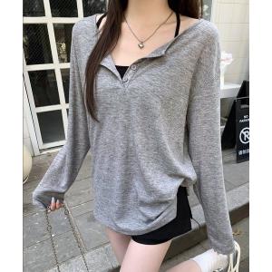 tシャツ ルーズヘンリーネック リブニットトップス 長袖/ルーズシルエットカットソー ロンT レディース