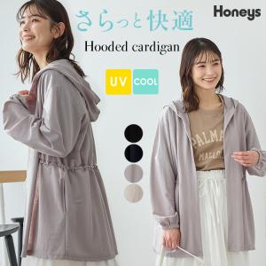 トップス カーディガン 長袖 ハニさら UVカット 接触冷感 ボタンレス レーヨン混 ポケット 無地 レディース Honeys ハニーズ フーデッドカーディガン