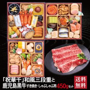 おせち 2026 鹿児島黒牛 セット 「祝華千」 冷蔵 6.5寸 三段重 全41品 3人前 「鹿児島黒牛」 冷凍 すき焼き しゃぶしゃぶ用 450g 送料無料 千賀屋