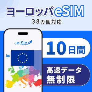 ヨーロッパ 38カ国 eSIM 10日間 高速データ無制限 即日発行 フランス・イタリア・イギリス対応 テザリング可