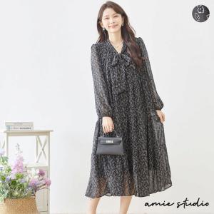 TRUBE ワンピース 40代 50代 60代 長袖 小花柄 ティアード シフォン レディース 婦人服 冬 春 M L 黒 通勤 日常 普段 旅行 ワンピース418 amie studio N82-596