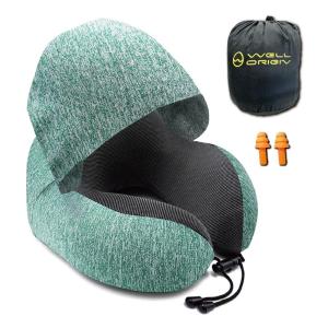 WELL ORIGIN ネックピロー フード付き 低反発 寝顔を隠せる 首枕 収納袋付き 飛行機 旅行 車 洗える 昼寝 (グリーン)