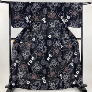 美品 浴衣 身丈164cm 裄丈66cm M 絞り浴衣 桜 菊 黒 綿 名品 中古