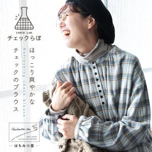 はちみつ堂 「チェックらぼ」の、ほっこり爽やかなチェックのブラウス レディース シャツ 長袖 パフスリーブ ノーカラー バンドカラー Aライン 綿 トップス