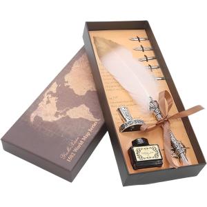 羽ペン クイルペン 万年筆 ペン立て アンティーク インクボトル セット レトロ 署名用 MDM( ホワイト)