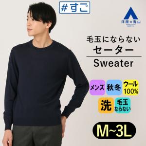 【洋服の青山】毛玉になりにくい ウール100% セーター ニット メンズ 秋冬 ネイビー 無地 大きいサイズ クルーネック 洗える シワになりにくい ビジネス