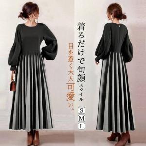 ワンピース ドッキング パフスリーブ 配色 可愛い プリッツ マキシワンピース 切り替え 着痩せ 通勤 通学 春秋 レディース