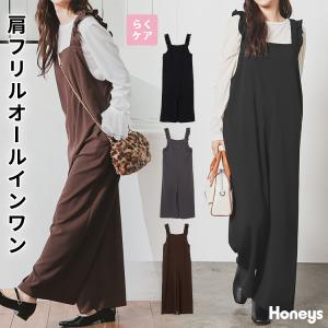 ボトムス オールインワン サロペット イージーケア シワになりにくい 肩フリル ジョーゼット 無地 ポケット レディース Honeys ハニーズ 肩フリルオールインワン
