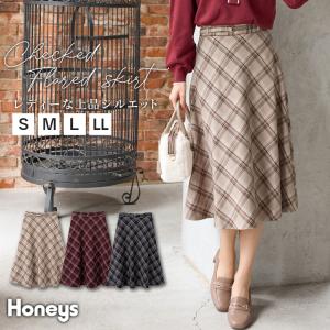 ボトムス スカート ひざ丈 オフィス きれいめ フレアスカート チェック柄 ベルト付き ストレッチ レディース Honeys ハニーズ チェック柄フレアスカート