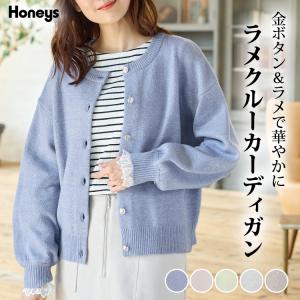 トップス カーディガン 長袖 大きいサイズ クルーネック ラメ糸入り フロントボタン ゴールドボタン レディース Honeys ハニーズ ラメクルーカーディガン