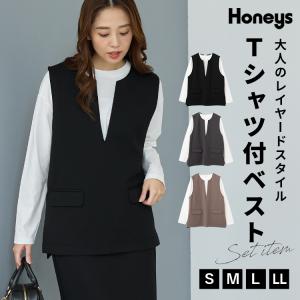 トップス ベスト ジレ Tシャツ ロンT 長袖Tシャツ カットソー ノースリーブ セット商品 無地 レーヨン混 レディース Honeys ハニーズ Tシャツ付ベスト